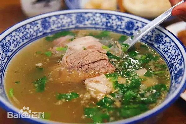 关中清真传统风味食品。据本世纪90年代编纂的《大荔商业志》记载:“早先人们烹制羊肉用的是砂锅,制成的羊肉,瘦肉红润,肥肉白亮,羊汤清澈见底。讲究暗油醇味,食之浓香可口。由于砂锅形状如盆,故称水盆羊肉。”多采取“明堂亮灶”的方式供应,以招徕顾客。因在农历六月上市,号称“六月鲜”。食用时将羊肉夹入热烧饼或白吉馍中,也可将烧饼泡入汤内食用,佐以鲜大蒜、辣子酱、糖蒜,清醇可口,别具风味。西安、大荔、蒲城一带的水盆羊肉久负盛名,为夏令消暑保健佳品。西安金家水盆羊肉在煮肉制汤时,还按老中医的建议,加入能养颜活血的香白芷和能健胃理气的越砂仁,使得本品的保健作用更强。
