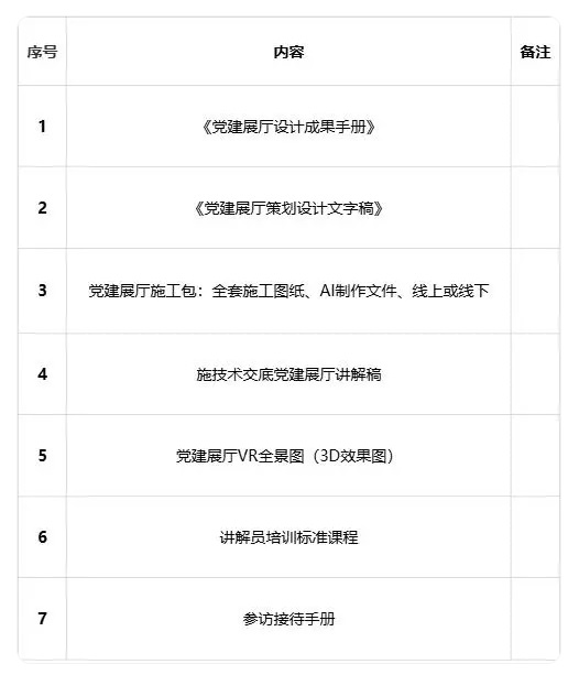 策划设计完毕后,输出党建展厅施工包,包括党建展厅施工技术交底、党建展厅施工图纸、AI制作文件。
