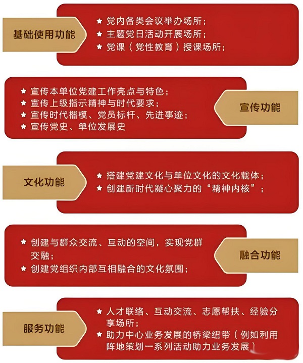 新时代背景下,党组织活动场所不仅要满足基础使用功能, 同时还要满足宣传功能、融合功能、文化功能、服务功能等多种作用,成为团结引领的精神堡垒 ,宣传教育的文化中心,党建活动的活动中心,链接群众的融合中心,成为新时代的党建展厅。