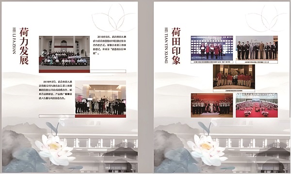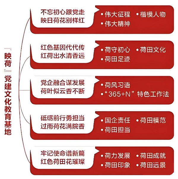 以该单位党建品牌“映荷”作为党建展厅主题,“映荷”取自“映日荷花别样红”,寓意该单位坚持党建引领 ,党建工作焕发生机;“映荷”谐音“硬核”,寓意履行国企担当,发挥“硬核”力量。